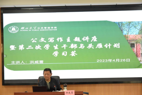 洪威雷教授寄语青年学子:知识的宽度决定人生职业生涯的高度。他鼓励同学们对哲学、管理学、社会学等多学科广泛涉猎,力争做到知识交叉,由交叉点扩大到面。只有多读、多思、多悟、多练笔,才能为公文写作打下良好的基础,真正达到毕业就能就业、上岗就能上手,成为党和国家的有用人才。