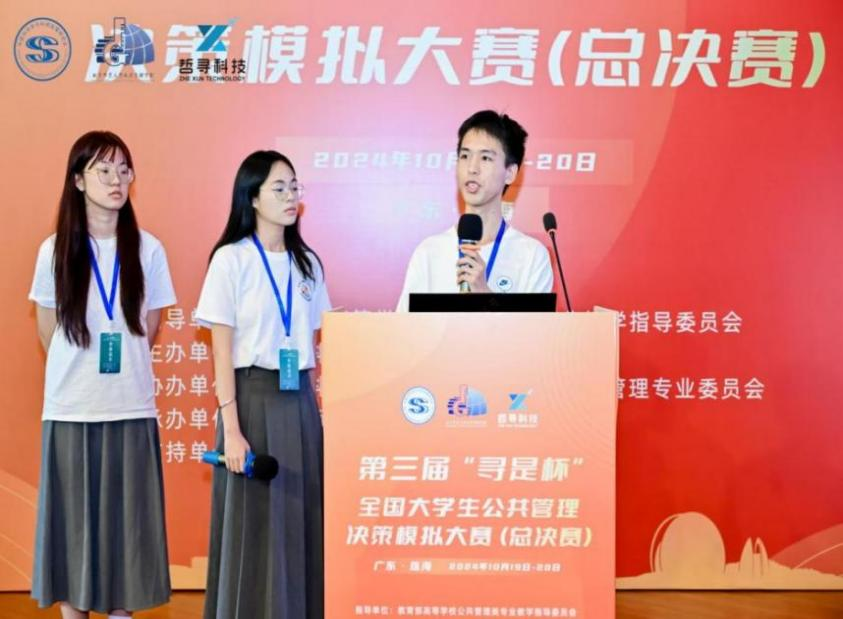 10月19日至20日,由教育部高等学校公共管理类专业教学指导委员会指导、中国科学学与科技政策研究会主办、中国科学学与科技政策研究会公共管理专业委员会协办、北京师范大学政府管理学院承办的第三届“寻是杯”全国老员工公共管理决策模拟大赛(总决赛)在北京师范大学珠海校区成功举办,来自全国90所高校的近500位师生参赛,15位公共管理学科的知名专家学者担任大赛评委。公司由王伊菲、字概光、郑安琪三名本科生组成的“城市筑梦师3.0”队,在陈娟老师、谢迪老师的指导下荣获全国一等奖。