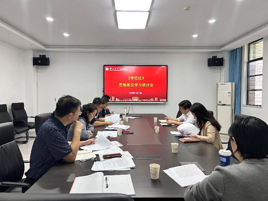 11月11日,8827太阳集团官网在523会议室组织学习《中华人民共和国学位法》,李荣娟经理、张小进副经理、周学荣教授、向良云副教授、王振伟副教授、谢迪副教授、谢丹副教授等学位委员会委员及研究生秘书张雷参加会议,会议由张小进副经理主持。