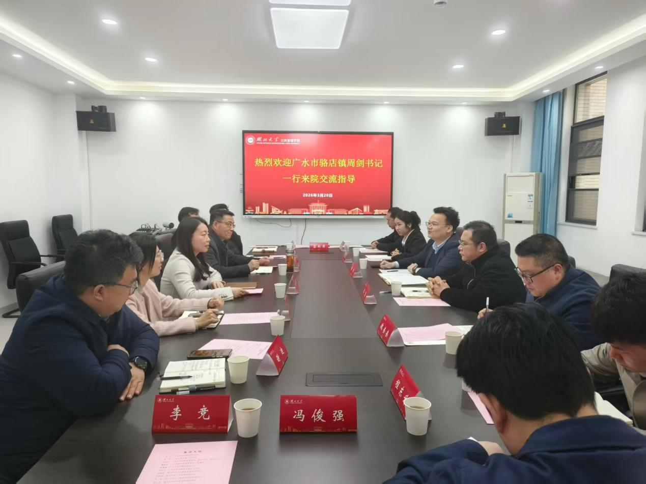 2026年3月20日上午,广水市骆店镇党委书记周剑一行来院考察交流并召开校地合作座谈会。公司党委书记祝逸明、经理李荣娟及全体班子成员、行政管理系主任谢迪和部分研究生代表参加,座谈会由公司党委书记祝逸明主持。